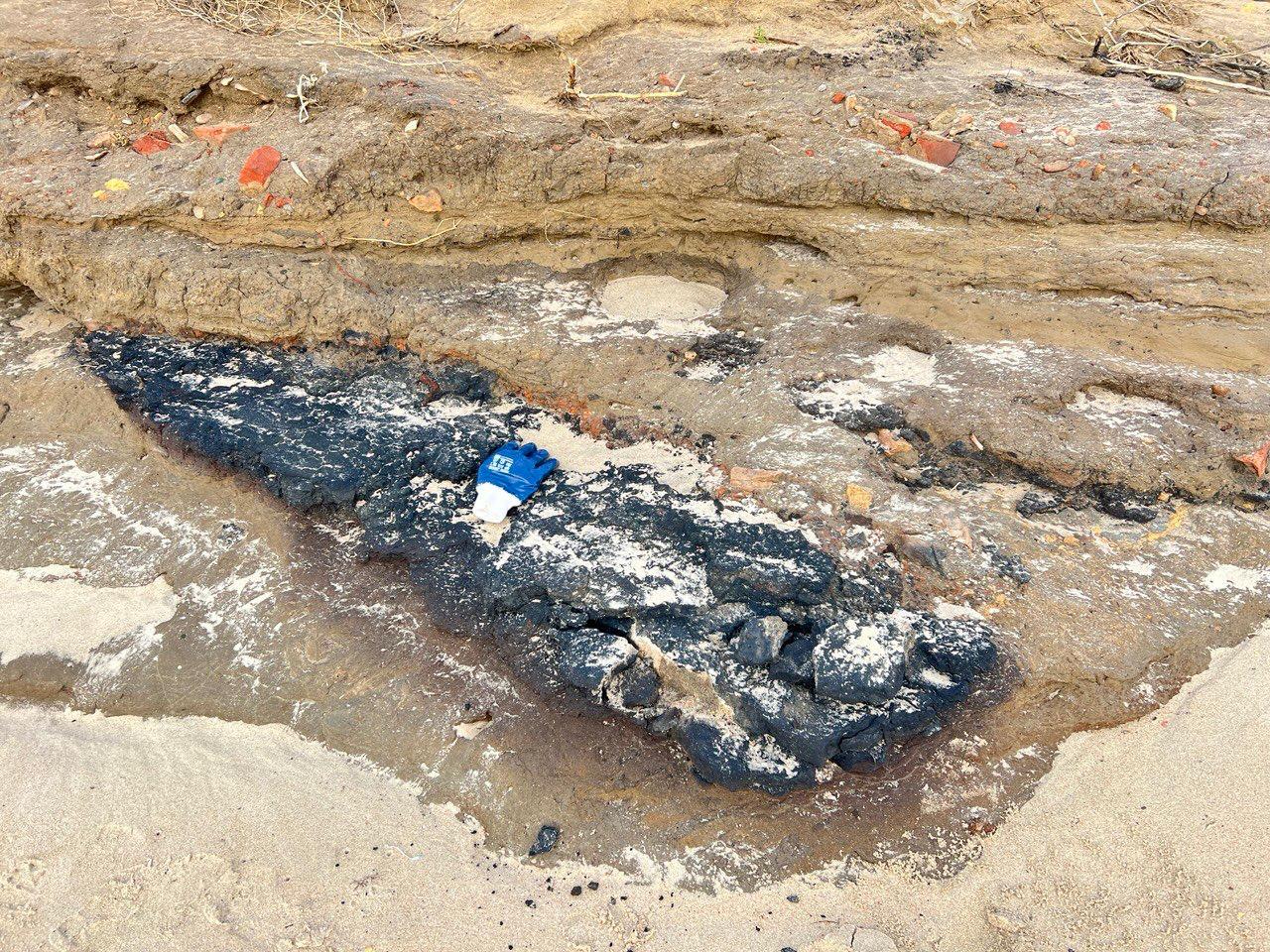13 января участники штаба «Дельфины» заметили ужасающую картину на берегу соленого озера близ Веселовки. Волонтерам бросились в глаза залежи твердых маслянистых масс, погребенных в прибрежном песке. Это было последствие недавнего сильного шторма.