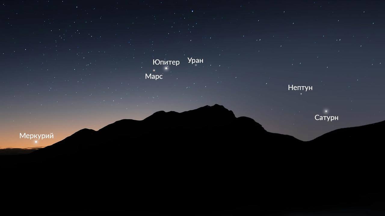 На утреннем небе выстроятся шесть планет — Меркурий, Марс, Юпитер, Уран, Нептун, Сатурн, а также Луна. Все они будут находиться по одну сторону от Солнца.