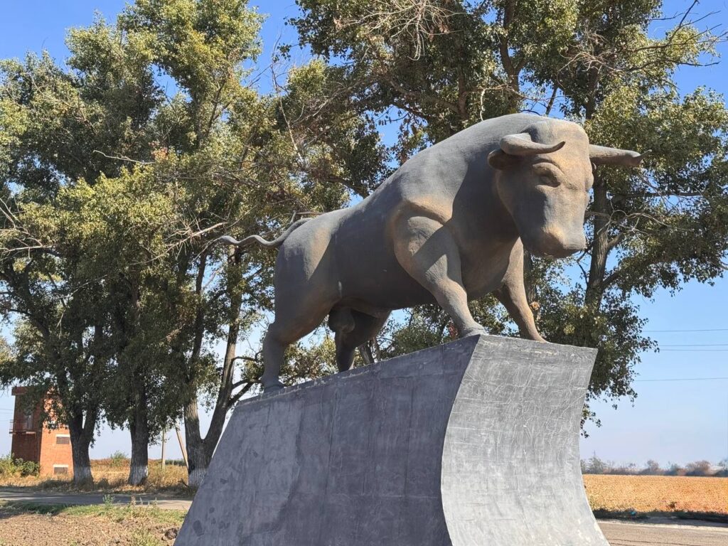 Более монументальный и в чем-то даже мифологический образ встречает нас по пути в 4-е отделение АО «Рассвет» — памятник быку.