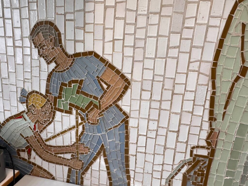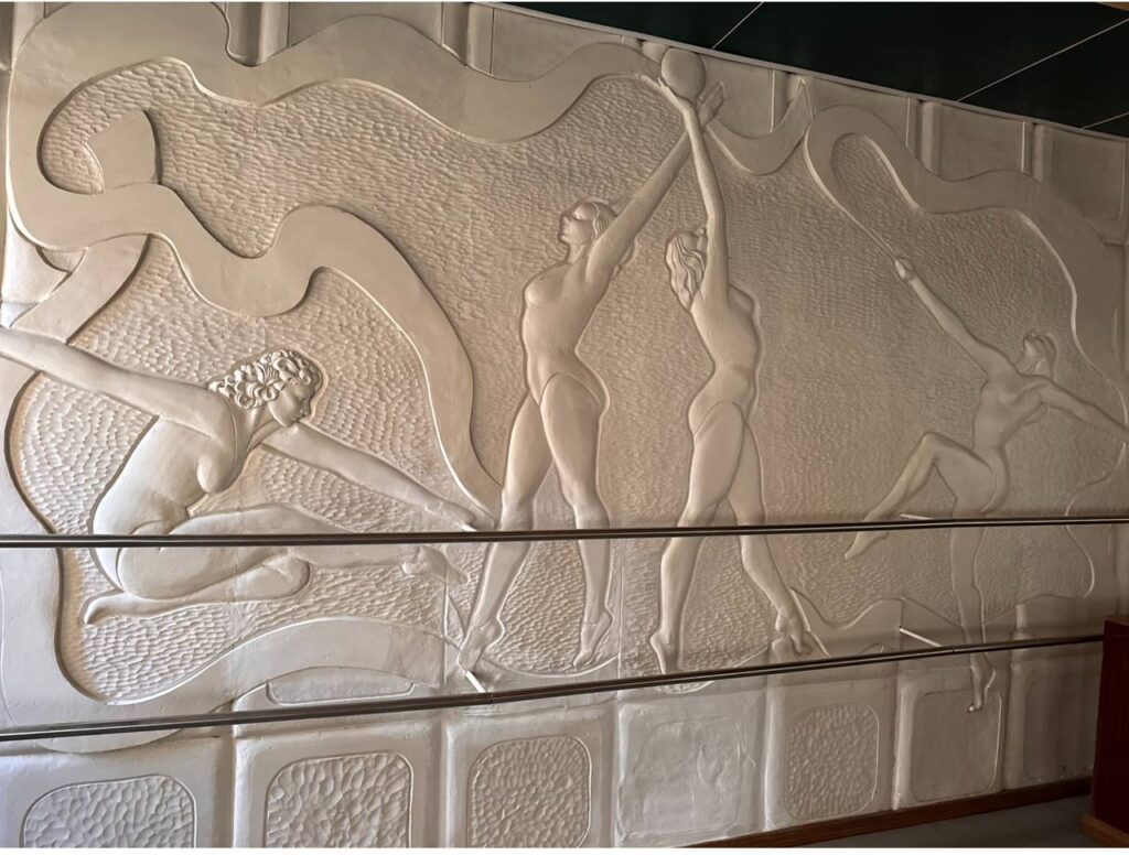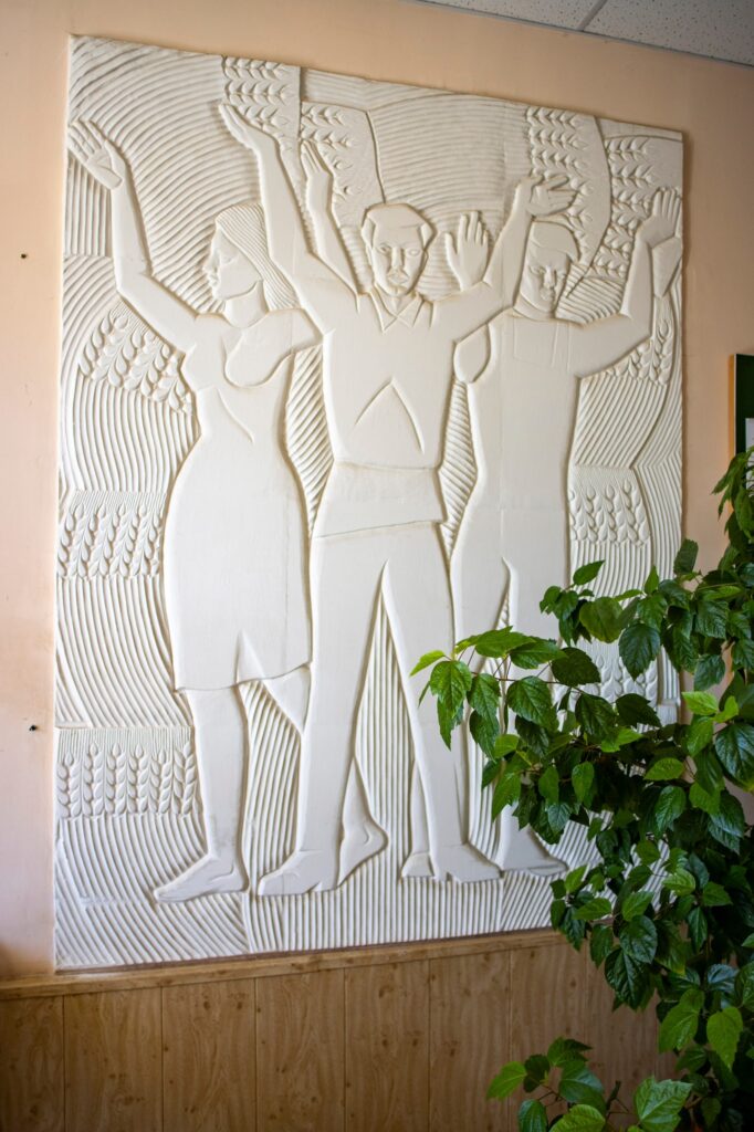 Еще одним распространенным жанром монументального искусства был барельеф. Эти скульптурные композиции, выступающие из стены, служили доступным и наглядным способом художественного оформления общественных пространств. Яркие примеры сохранились в помещениях управления Усть-Лабинского элеватора и в здании клуба сахарного завода «Свобода». Если на элеваторе тематика посвящена аграрному труду, то на сахарном заводе это искусство иного плана: на стенах клуба застыли в изящных позах балерины и гимнасты. Это противопоставление не случайно: оно отражает ключевой принцип советской идеологии — гармоничное развитие человека, где физический труд на благо Родины неразрывно связан с духовным обогащением и творческим досугом.