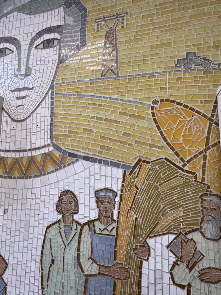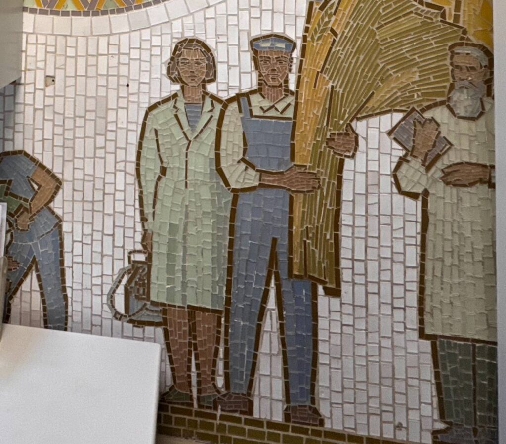 Еще два панно посвящены теме сельского хозяйства, трудового подвига и знаний. Это типичная для советского монументального искусства трактовка прославления советского труда: на подобных панно часто изображали силу коллективных усилий, динамику механизации, сцены сбора урожая, трактористов, доярок, а изысканная орнаментика сочеталась с главными призывами эпохи. К сожалению, информация о художниках или дате создания этих панно не сохранилась. Для советской эпохи было характерно коллективное творчество, когда имена авторов терялись в потоке государственного заказа.