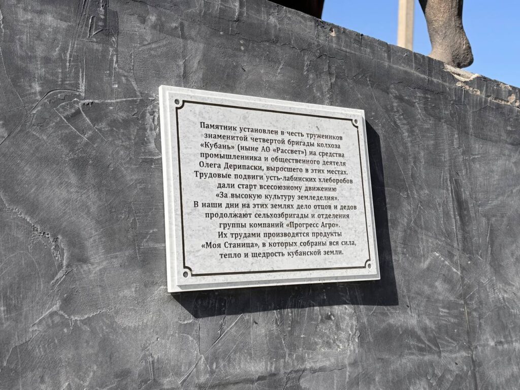 На въезде в Усть-Лабинск, по пути в 4-е отделение АО «Рассвет» (входит в ГК «Прогресс Агро») установлен памятник быку. Это уже не наследие советской эпохи, а современный арт-объект. Монумент здесь появился в честь тружеников знаменитой четвертой бригады колхоза «Кубань», чьи трудовые подвиги стали примером для всей страны. Именно работа этой бригады под руководством легендарного Михаила Ивановича Клепикова дала старт всесоюзному движению «За высокую культуру земледелия» и вдохновила тысячи сельхозпроизводителей на новые достижения.