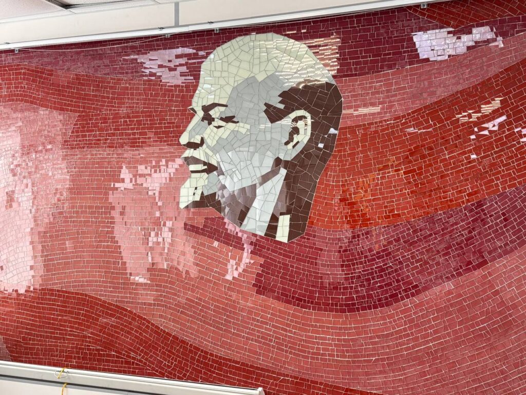 Портрет вождя мирового пролетариата сохранился не только снаружи здания Центра контроля качества, но и внутри. В актовом зале, на ярко красном мозаичном фоне, выложен профиль Владимира Ильича. Такие залы были центрами общественной жизни колхоза: здесь чествовали передовиков, обсуждали новаторства, отмечали праздники. Именно в этом помещении, по словам сотрудников, принимались все самые важные решения, звучали вдохновляющие речи партийных руководителей.