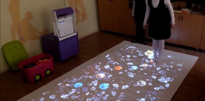 Интерактивный мобильный комплекс представляет собой передвижную проекционную систему, которая объединяет сенсомоторные игры и современные технологии, превращая пол помещения в сенсорную поверхность. С помощью компьютера, проектора и датчика на пол проецируется интерактивная поверхность, реагирующая на нажатия с применением реальных предметов и игрушек, используемых педагогами в ходе занятия.