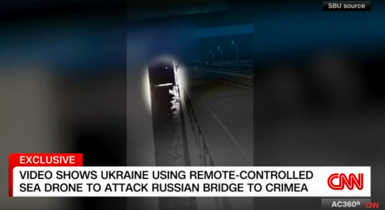 Служба безопасности Украины (СБУ) передала американскому телеканалу CNN видеозапись, на которой виден момент удара морских беспилотников по Крымскому мосту в июле нынешнего года.