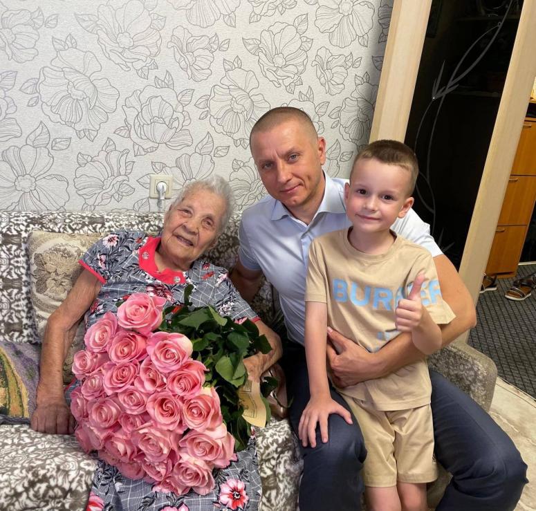 Председатель комитета по строительству, градостроительной и архитектурной деятельности краевого центра Андрей Анашкин вместе с сыном Ильей посетили жительницу краевого центра, почетного гражданина Краснодара и вручили ей букет роз и памятные подарки.