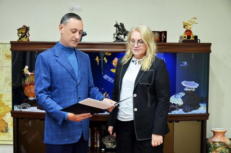 Депутат ЗСК Виктор Тепляков вручил почетную грамоту от имени председателя кубанского парламента Юрия Бурлачко главному врачу больницы № 8 Сочи Марине Бралюк.