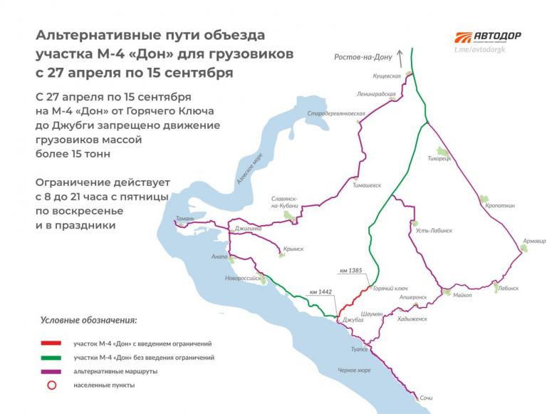 На федеральной трассе М-4 “Дон” в Краснодарском крае вводят традиционное летнее ограничение на движение большегрузов массой более 15 тонн. Для них закроют участок трассы от Горячего Ключа до Джубги с пятницы по воскресенье и в праздничные дни с 08:00 до 21:00. По-прежнему грузовики смогут проезжать по трассе в будни круглосуточно и в ночные часы по выходным и праздникам.