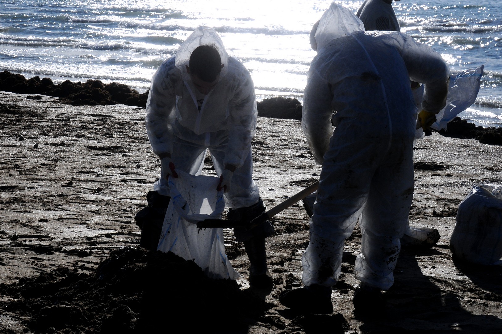 Студотряд работает в районе пляжа “Малахит”. Они занимаются просеиванием песка от мазута, который в условиях холодов затвердел в виде небольших сгустков.