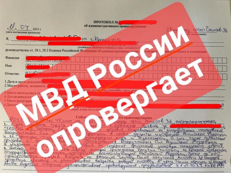 В полиции опровергли информацию о том, что жителя Краснодара оштрафовали за выброшенную в мусорку листовку с рекламой военной службы по контракту. Соответствующий протокол, якобы составленный на мужчину, распространяется по социальным сетям. На фотографии можно прочитать, что в действиях некоего Бондарева усмотрели дискредитацию ВС РФ.