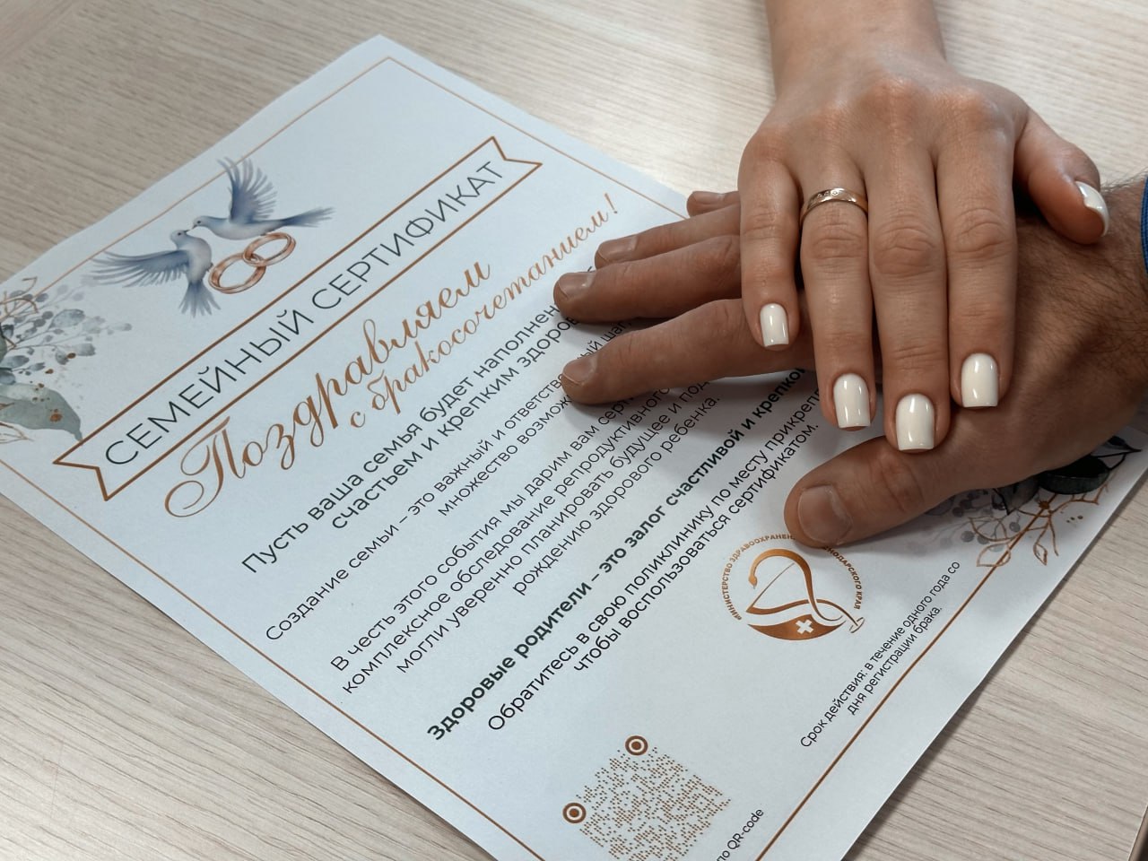 В Краснодарском крае молодоженам власти сделали новый подарок. Теперь вместе с вручением свидетельства о заключении брака в загсах им будут дарить сертификат “Семейный”. По нему можно будет бесплатно и без очереди проверить репродуктивное здоровье в поликлиниках края.