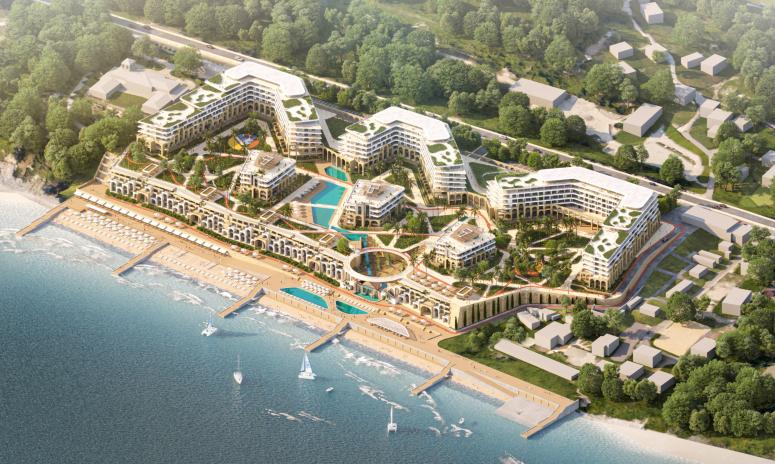 Отель займет 7 гектаров территории. На этой площади расположат гостиницу из 10 корпусов, ресторан, СПА-центр, детскую игровую зону, бассейн, амфитеатр со спуском к набережной и другие объекты. Работать там смогут около 700 человек, а отдыхать единоразово - 2,5 тысячи туристов.