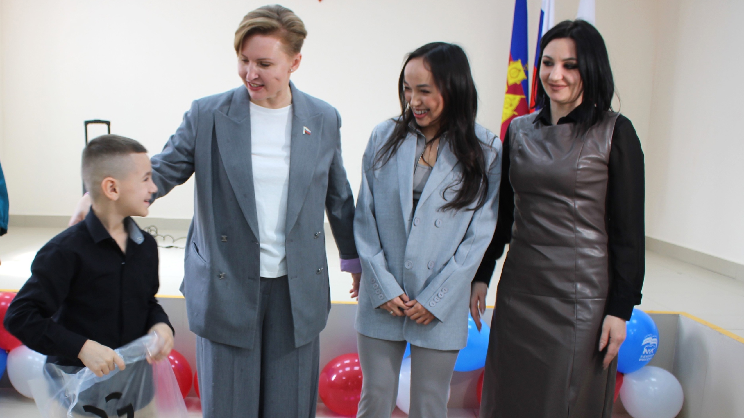 Ребятам преподнесли небольшие подарки — комплекты спортивной формы, которые производит наше краснодарское предприятие. Владелица бренда концептуальной спортивной одежды Дарья Суслова вместе с Натальей Кулишовой вручили их детям.
