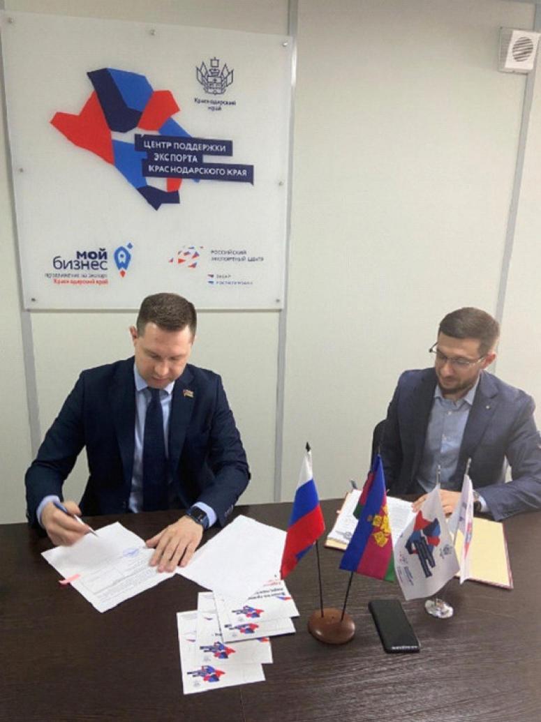 Фонд развития и Центр поддержки экспорта Краснодарского края заключили соглашение о сотрудничестве. Подписи в документе поставили муниципальный депутат Илья Шакалов и директор центра Роман Воротников.
