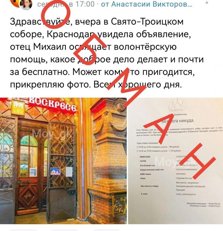 Кубанская митрополия выпустила опровержение информации об установлении тарифов на освящение гуманитарной помощи, отправляемой в зону спецоперации в Украине. Ранее подобный пост появился в социальной сети “ВКонтакте”. Автор поста выложил фотографию некоего объявления о том, что в Свято-Троицком соборе за совершение религиозного обряда над посылками нужно заплатить от 780 до 1230 рублей.