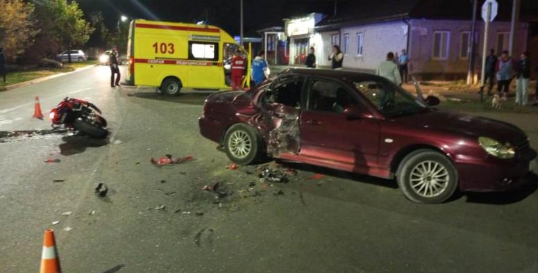 Авария произошла ночью 29 октября в столице Адыгеи, на перекрестке улиц Пушкина и Подгорной. Предварительно установлено, что 42-летний местный житель, управлявший иномаркой, совершая левый поворот на нерегулируемом перекрестке, не пропустил мотоциклиста, имевшего преимущество в движении, и врезался в байк.