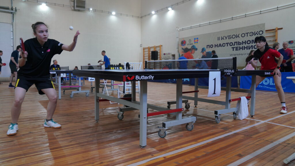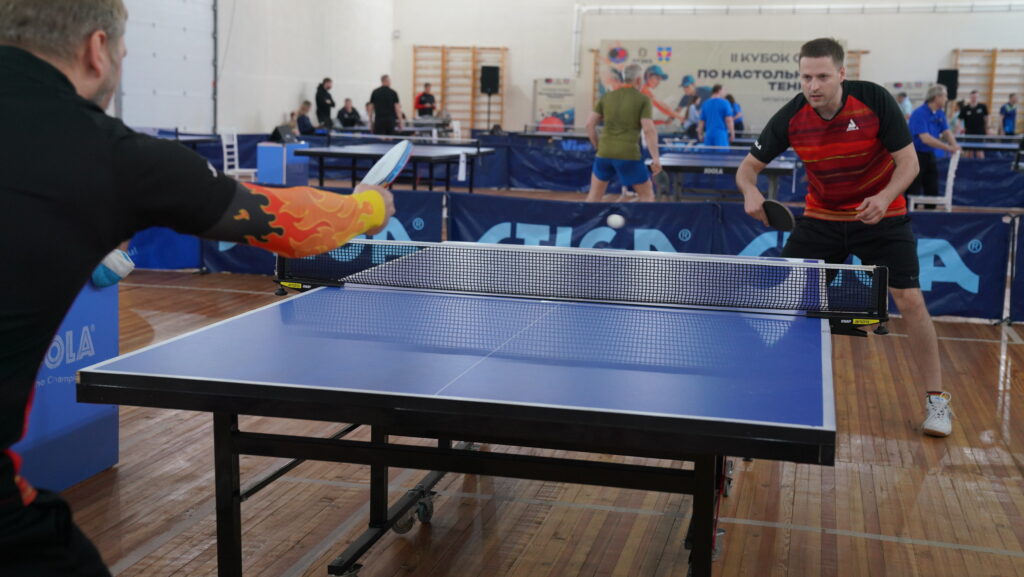 Зал уже наполнен гулом разминки: мячи щёлкают о ракетки и поверхность столов, кроссовки скрипят, кто-то смеётся после досадной ошибки, кто-то сосредоточенно молчит. Среди готовящихся к турниру участников выделяется высокий богатырь под метр девяносто, победитель прошлого года — Константин Алатырцев, приехавший сюда в день своего рождения. В яркой чёрно-красной футболке своей команды, с ракеткой в руке, он переходит от столика к столику, легко перекидывая мяч, с явным азартом в глазах. Движения плавные, выверенные, мяч летит точно в угол.