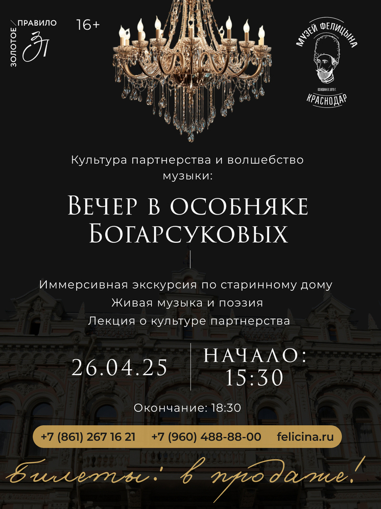 Билеты уже в продаже https://widget.afisha.yandex.ru/w/sessions/ticketsteam-3857@44252484?clientKey=6474c6f4-b13d-4579-bf76-3d194a719e6f®ionId=35! Не упустите шанс принять участие в совместной премьере музея имени Е. Д. Фелицына и Юридической компании «Золотое правило», и стать частью волшебства в особняке Богарсуковых.