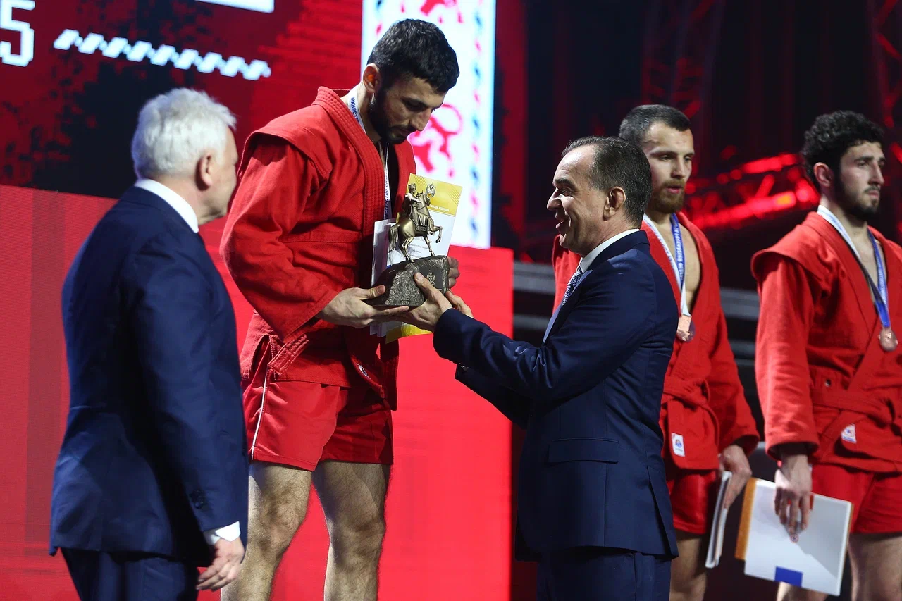 В Краснодаре во дворце самбо завершился финал чемпионата России по этому виду спорта. Награды победителям и призёрам вручили губернатор Краснодарского края Вениамин Кондратьев и глава Всероссийской федерации самбо Сергей Елисеев.