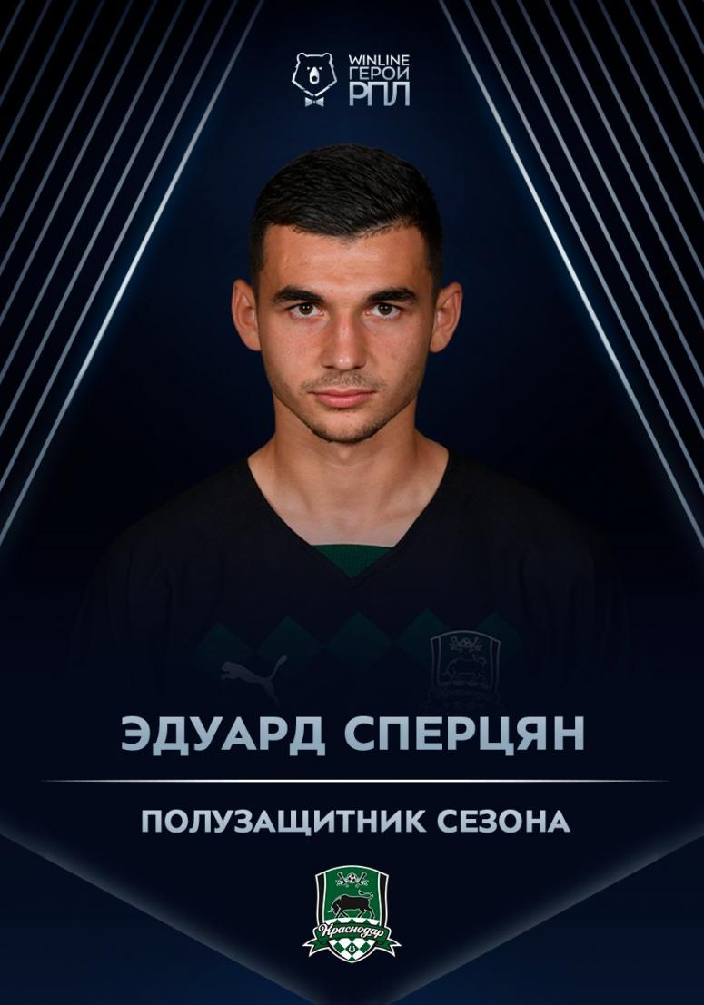 Полузащитник футбольного клуба “Краснодар” Эдуард Сперцян признан лучшим на этой позиции в Российской премьер-лиге по итогам прошедшего сезона 2022/2023. Он также вошел в символическую команду. Главные итоги сезона подвели на торжественной церемонии в Москве.