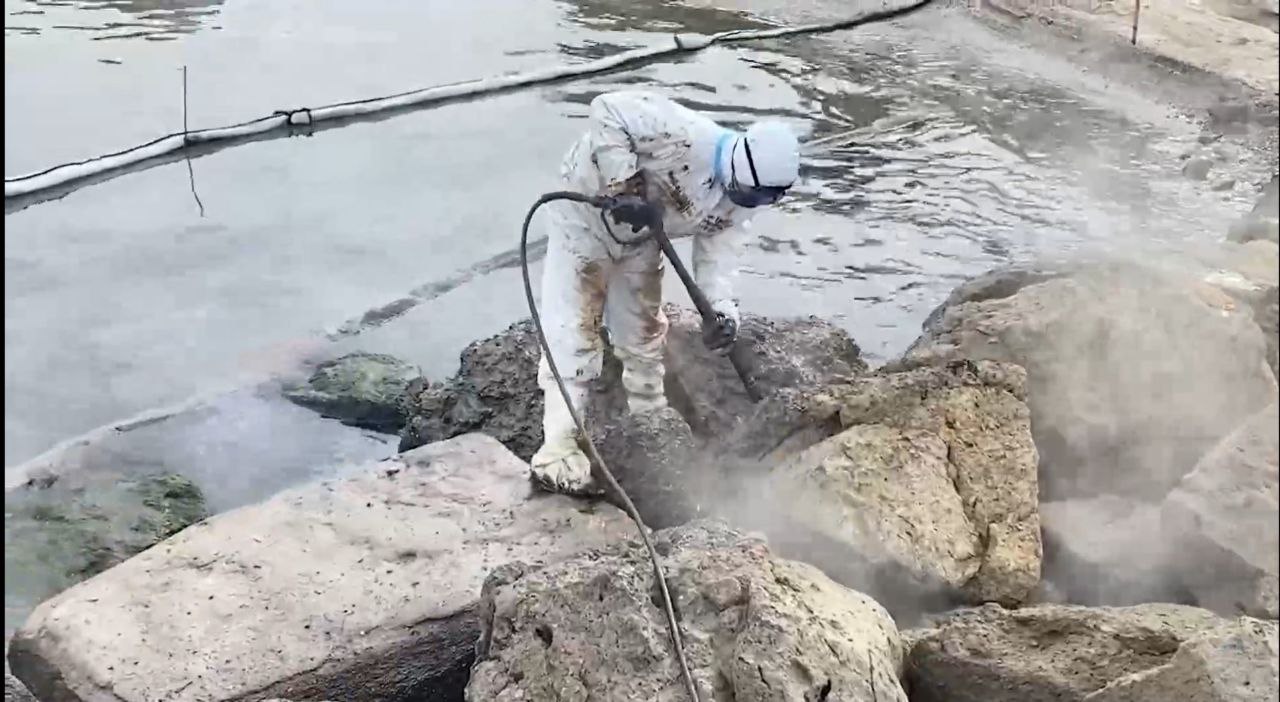 На первом этапе прилипшие к камням нефтепродукты собирают вручную и при помощи лопат. На втором этапе валуны промывают горячей водой и паром с помощью мойки высокого давления.