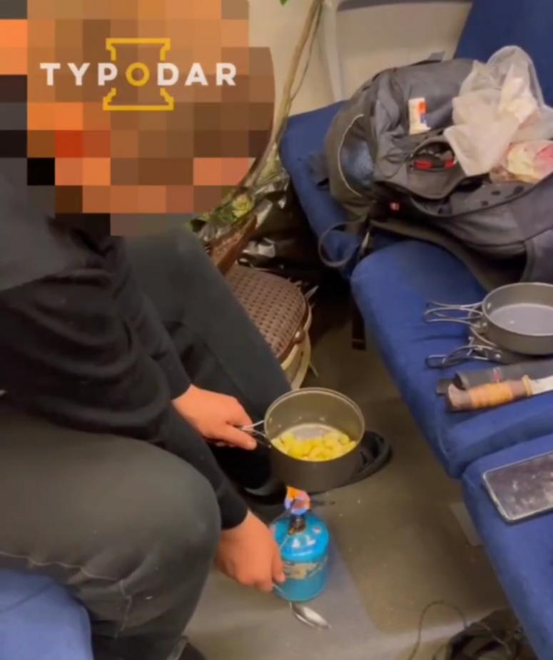 Пассажир электропоезда "Ласточка" разогревает себе еду на газовой горелке