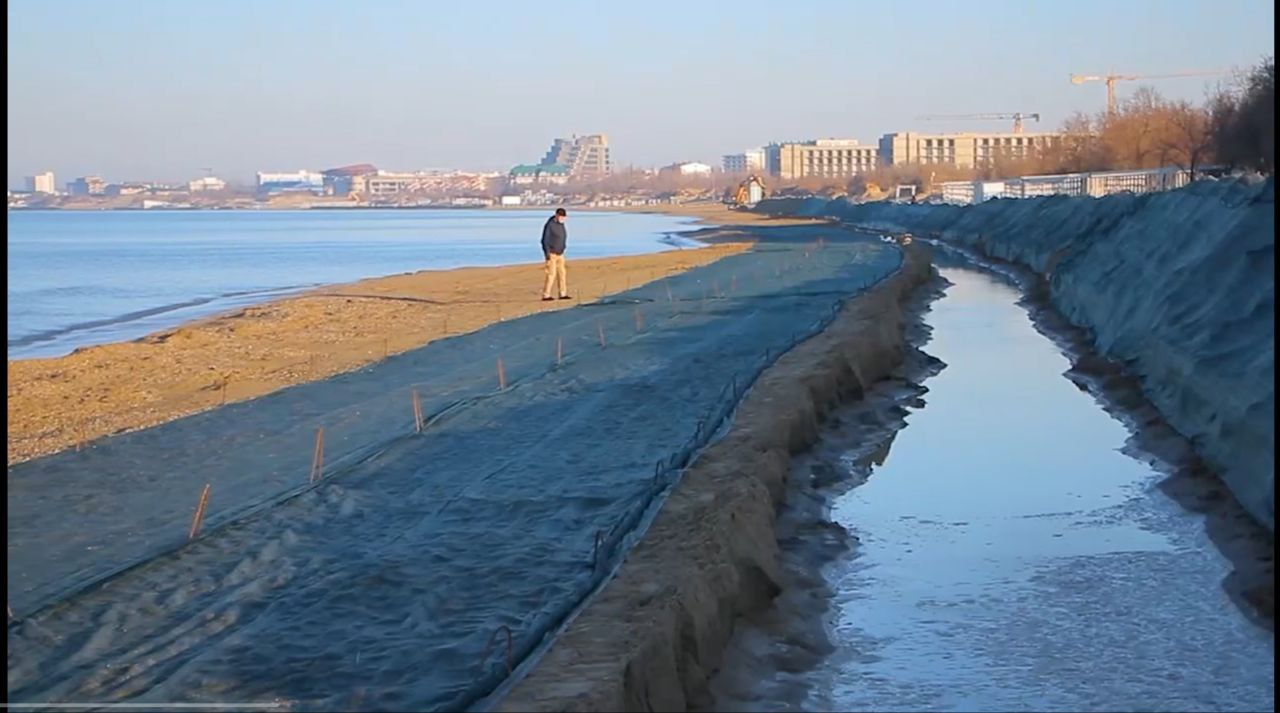 На Центральном пляже Анапы для защиты от выбросов мазута из моря выкопали ров и соорудили заградительный вал высотой 2 метра. На вал положили полипропиленовую сеть, чудесные свойства которой в сборе нефтепродуктов ранее открыл руководитель группы проектов развития “Сколтеха” Владимир Каляев.