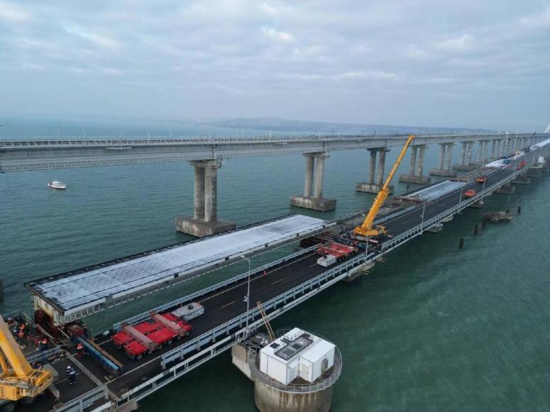 "На Крымском мосту завершена надвижка второго пролета по левой стороне автомобильной части. Через несколько дней пролет займет свое проектное положение. Надвижка первого пролета была выполнена несколько дней назад, он уже занял свое место на опорах моста. Можно сказать, что закончена практически половина запланированных работ по замене пролетов левой стороны", - отметил вице-премьер.