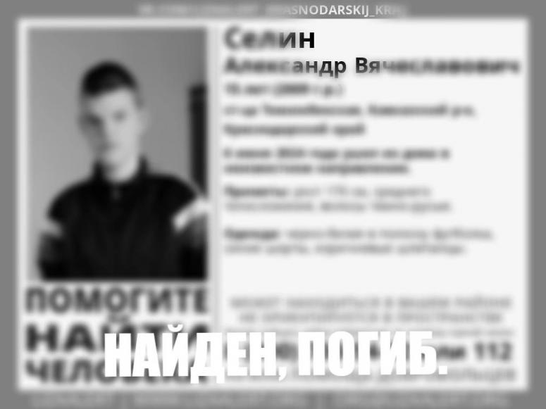 В станице Темижбекской Кавказского района Краснодарского края нашли погибшим 15-летнего Александра Селина. Об этом сообщает региональный поисковый отряд “ЛизаАлерт”. Подробности и обстоятельства смерти юноши не сообщаются.