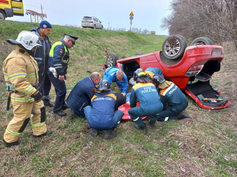 На место ДТП оперативно выехали сотрудники Тимашевского аварийно-спасательного отряда. Один из автомобилей, Opel Astra, находился в кювете, он был перевернут на крышу.