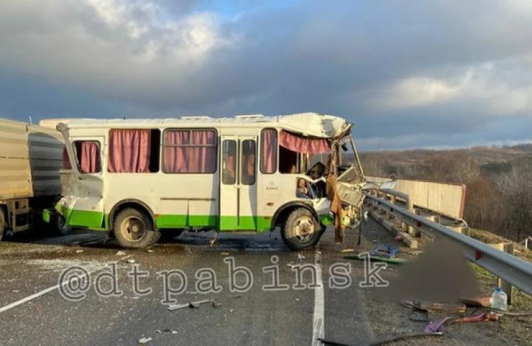 Столкновение двух транспортных средств — вахтового автобуса ПАЗ и грузовика DAF с прицепом — произошло вечером 6 февраля на 93-м километре автодороги Краснодар – Верхнебаканский в Абинском районе Кубани.