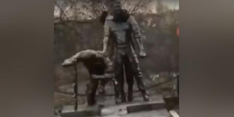 Хулиган, поддерживаемый одобрительными смешками сослуживцев, дал пощечину одной из фигур памятника, на второй отработал удушающий прием и завершил процесс пинками.