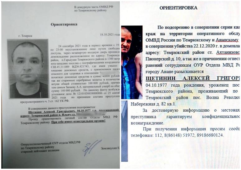 Напомним, 44-летний Алексей Щетинин подозревается в серии краж в Темрюкском и Анапском районах, разбое в селе Гарькуши и убийстве в станице Ахтанизовской. В октябре прошлого года силовики пытались задержать его, ворвавшись в его дом в Темрюкском районе, но там его не оказалось.
