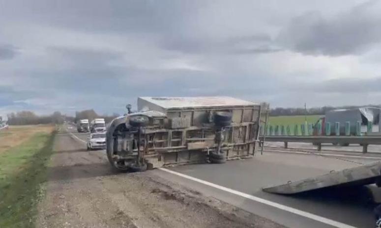 Днем 29 ноября в Северском районе Краснодарского края, на 42-м километре федеральной автодороги А146 Краснодар – Верхнебаканский из-за сильного порывистого ветра произошло ЧП — опрокинулись два грузовика.