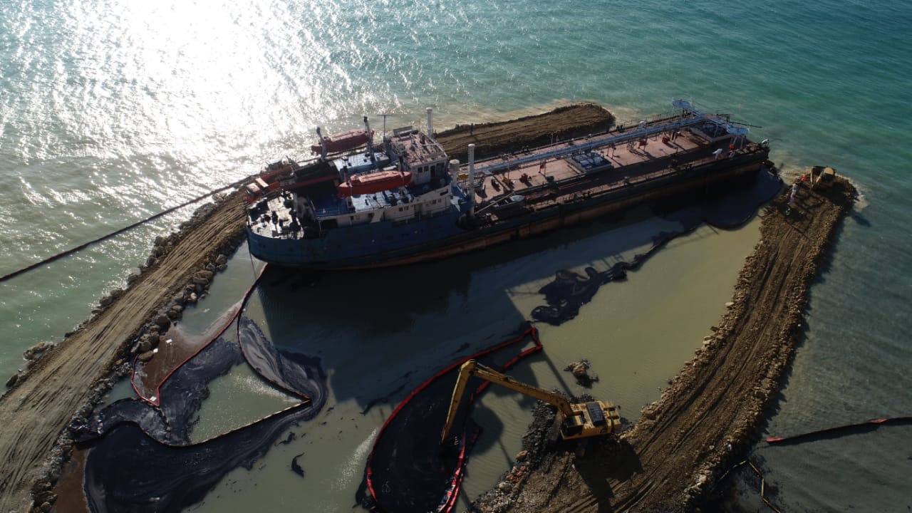 Первый этап откачки мазута из стоящего на мели танкера “Волгонефть-239” стартовал у мыса Панагия. Дорогу к танкеру уже проложили, а вокруг корпуса судна устроили искусственную насыпь протяженностью 400 метров.