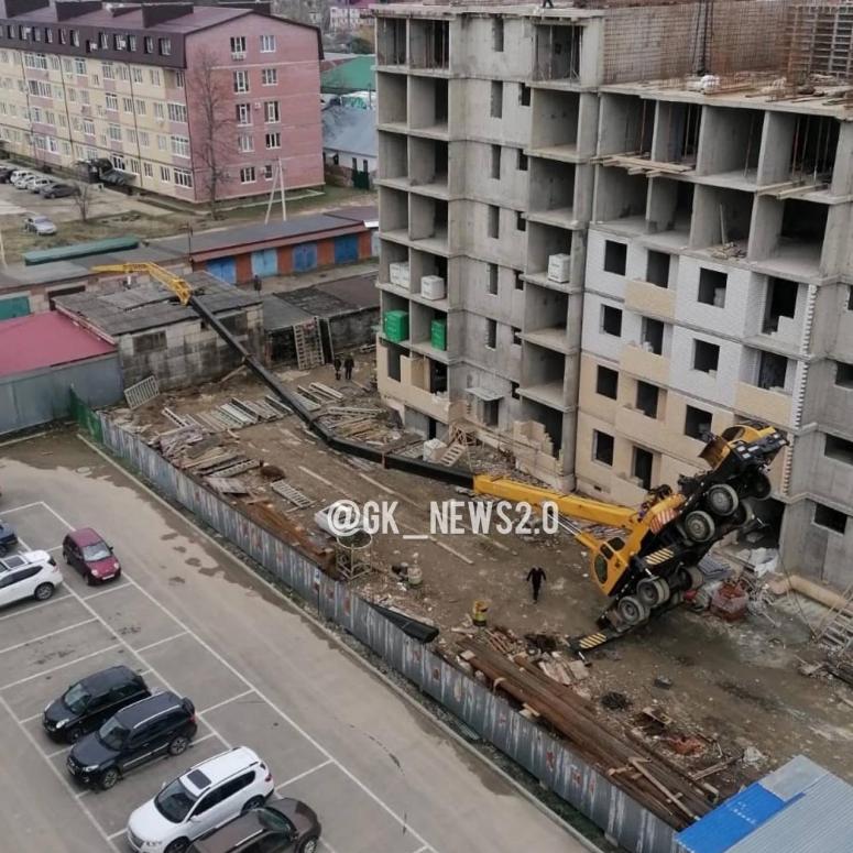 Строительный кран, находящийся на строительной площадке в Горячем Ключе недалеко от озера (улица Рябиновая, 2б), упал на соседнюю постройку. Фото произошедшего очевидцы опубликовали в соцсетях.
