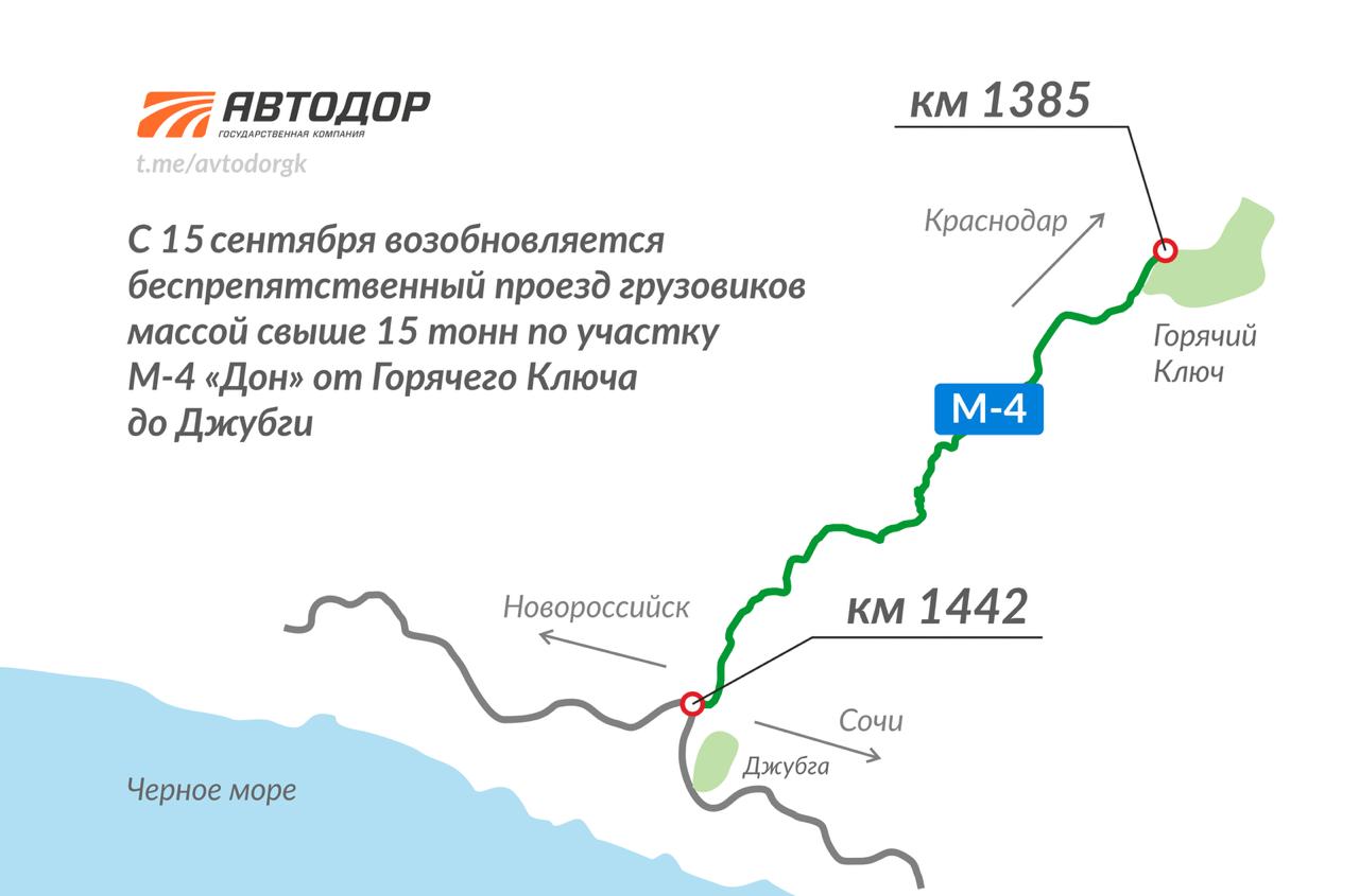 С 15 сентября на участке федеральной трассы М-4 «Дон» в районе Горячего Ключа вновь разрешили движение грузовиков весом более 15 тонн в сторону Джубги. Ранее большегрузам нельзя было проезжать по этому маршруту по выходным и в праздничные дни с 8 утра до 9 вечера.