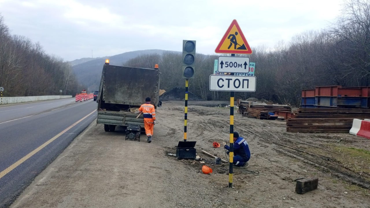 На федеральной трассе М-4 “Дон” в Краснодарском крае продолжается капитальный ремонт моста через реку Каверзе в районе Горячего Ключа. С сегодняшнего дня, 14 января, на 1398-м километре дороги установили светофор и ввели реверсивное движение.