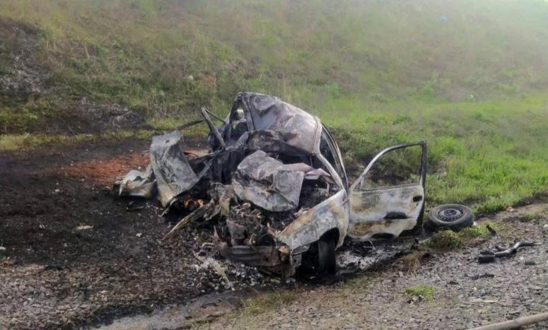 От удара легковушка загорелась. Находящееся в ней водитель и пассажир выбраться из горящей машины не смогли и погибли. Их личности устанавливаются. Огонь уничтожил автомобиль практически полностью.