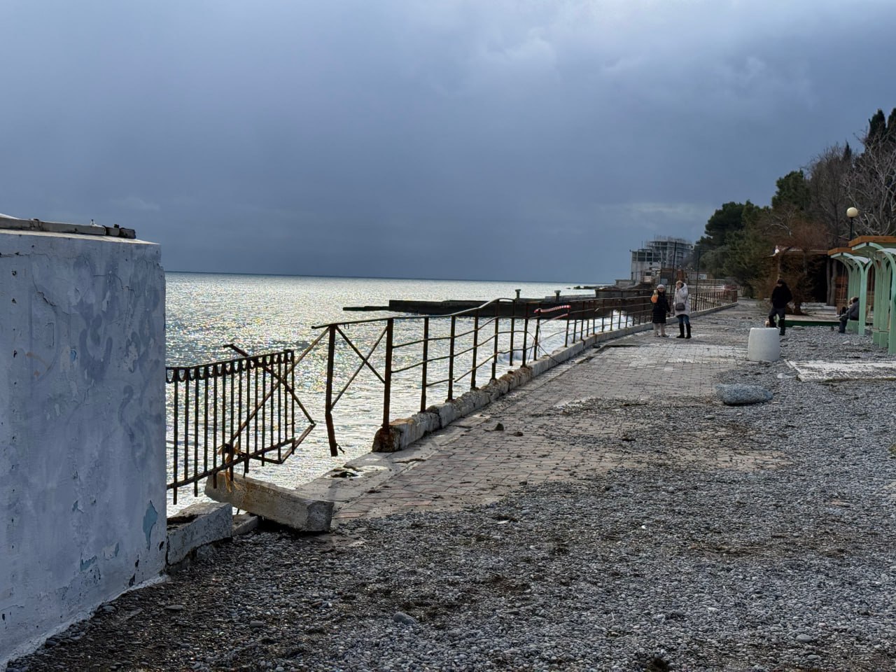 Шторм на море серьезно повредил набережную в Гурзуфе. Упал один пролет ограды, местами выбита тротуарная плитка.