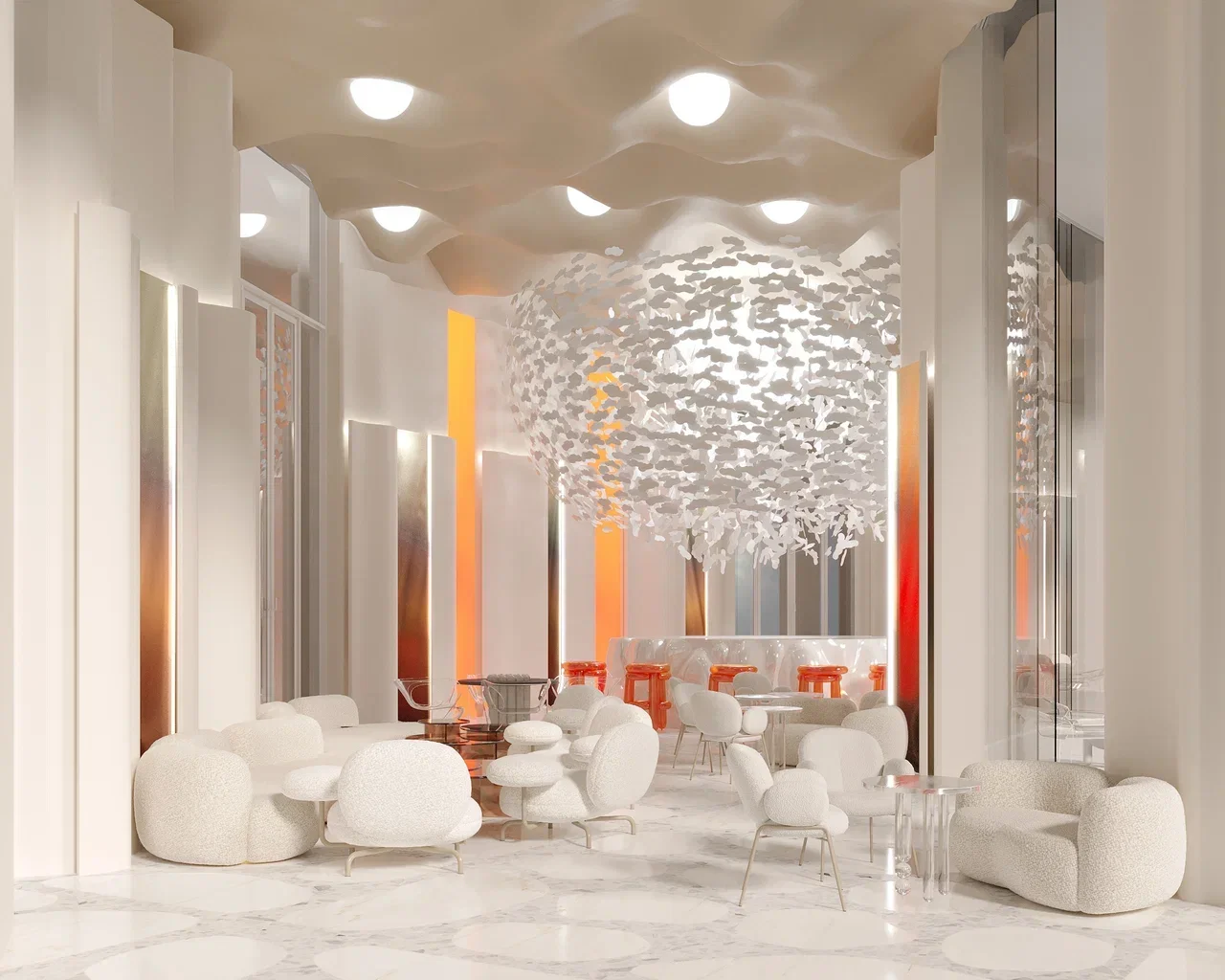 Центральным элементом интерьера станет необычная люстра, выполненная в форме скопления миниатюрных облаков. Благодаря своей объёмной конструкции, она одновременно напоминает пушистые перья, лепестки цветов или воздушный одуванчик. Её мягкое освещение придаёт помещению особую атмосферу уюта.