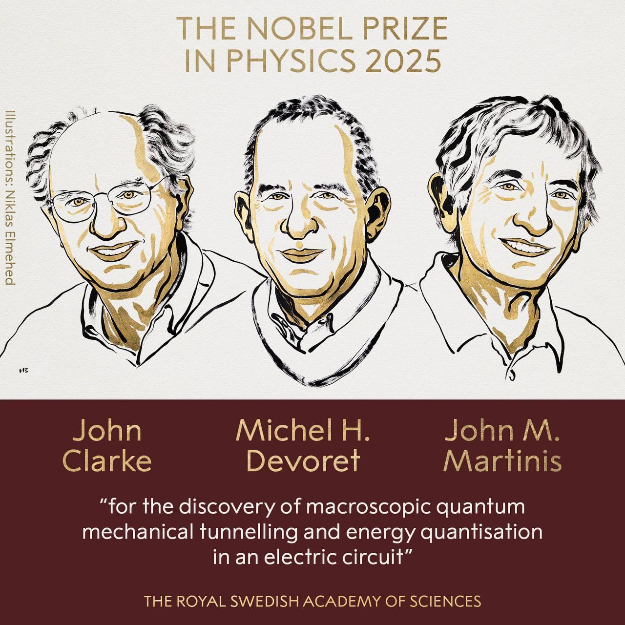В 2025 году Нобелевскую премию по физике присудили Джону Кларку из Великобритании, Мишелю Х. Деворе из Франции и Джону М. Мартинису из США за достижения в области квантовой механики. Как сообщается в официальном пресс-релизе Нобелевского комитета, лауреаты удостоены награды за открытие макроскопического квантово-механического туннелирования и квантования энергии в электрической цепи.