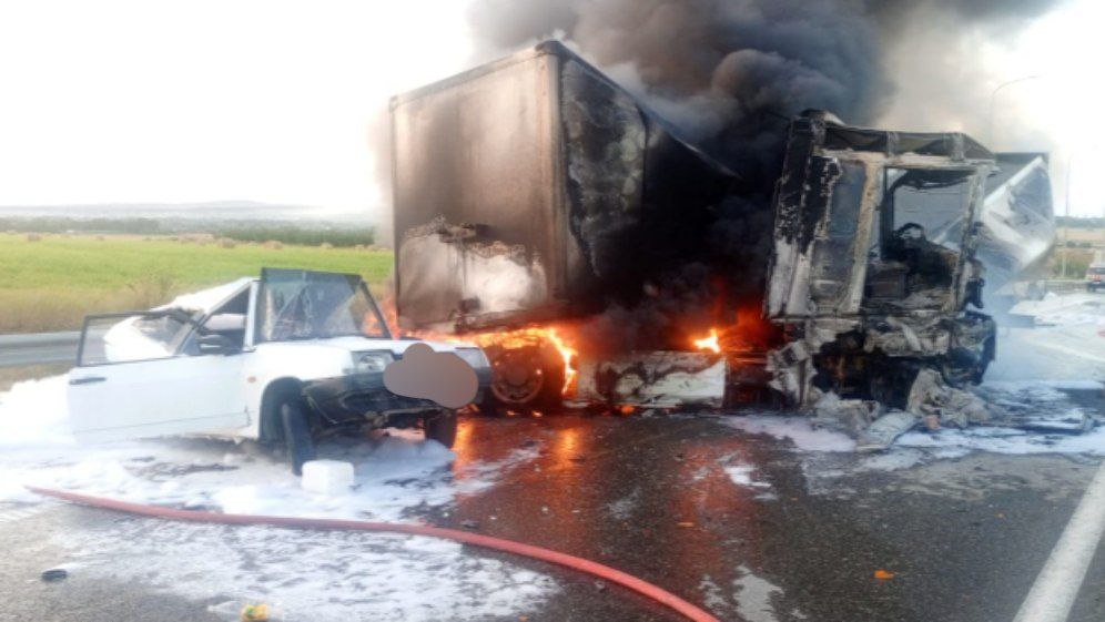 В Темрюкском районе на трассе Новороссийск - Керчь ранним утром в понедельник, 21 июля, произошло “огненное” ДТП. Грузовик Renault Magnum врезался во впереди ехавший ВАЗ-2108. Авария произошла в 04:20.