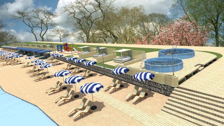 Согласно проекту, пляж займет более 4 тысяч кв. метров. Там установят шезлонги, теневые беседки для отдыха, детскую и спортивные площадки. Будет организована гриль-зона, для рыбаков поставят баки.