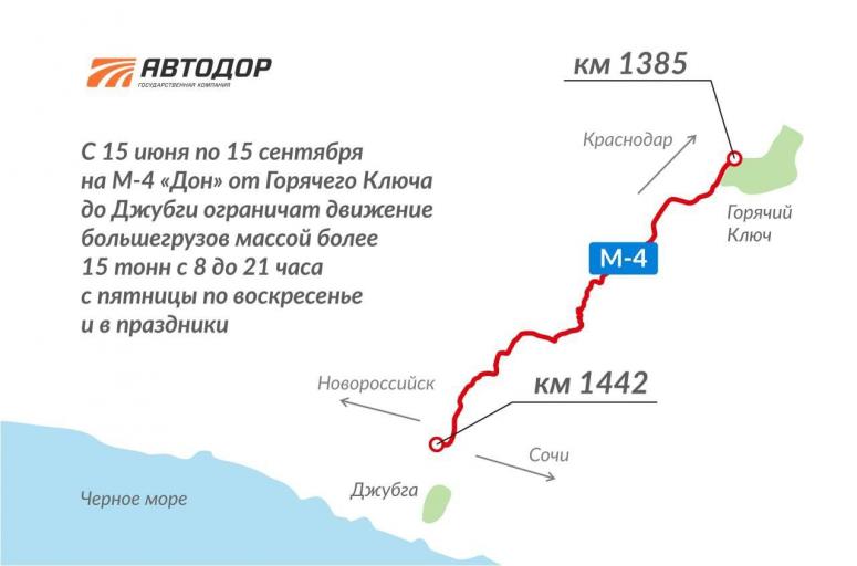 С сегодняшнего дня, 15 июня, в Краснодарском крае грузовым автомобилям ограничили проезд по федеральной трассе М-4 “Дон” на участке от Горячего Ключа до Джубги. Проехать нельзя будет по выходным и праздничным дням. Ограничение движения в начале июня анонсировал “Югополис”.