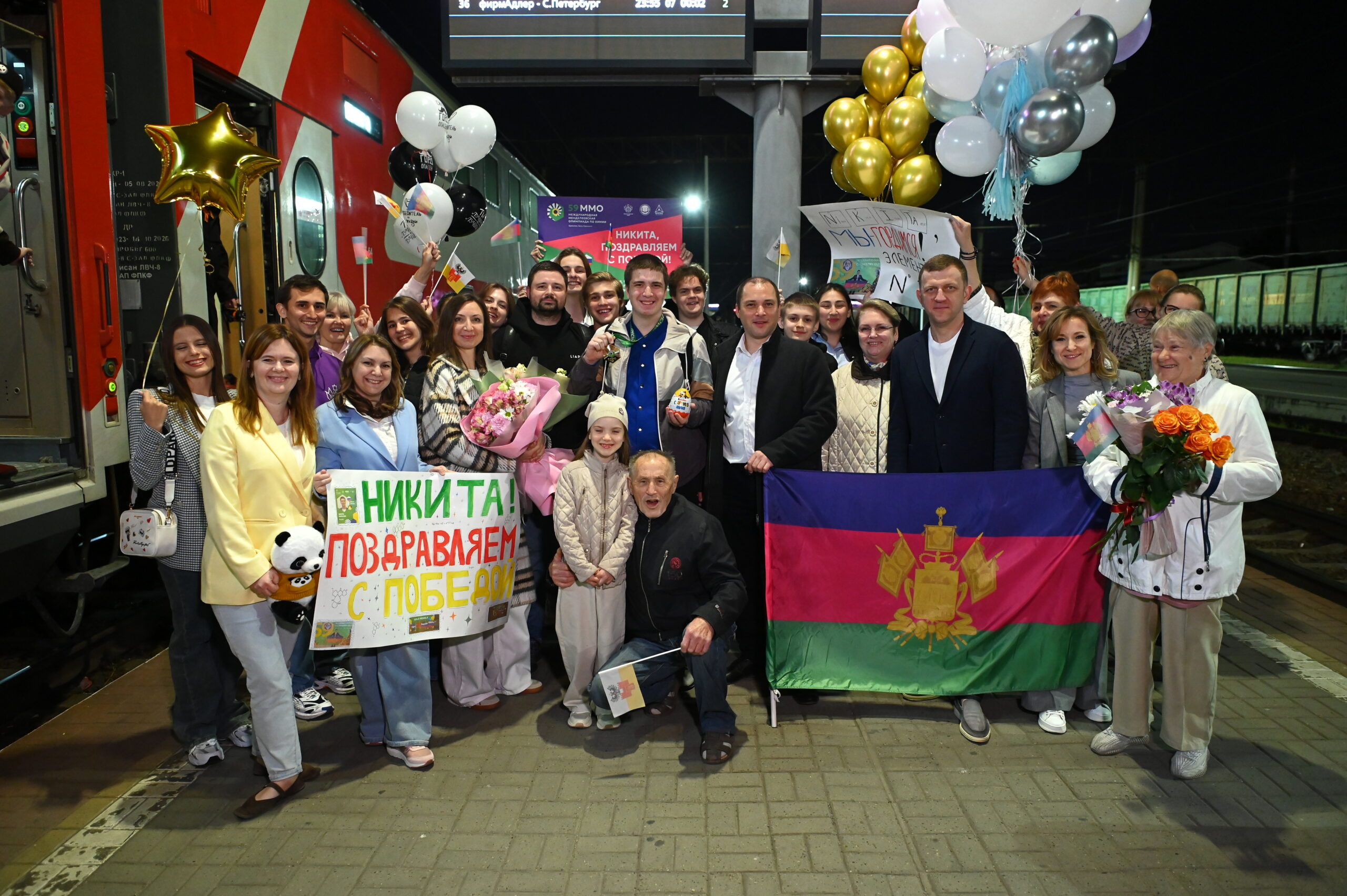 Вечером в среду, 14 мая, в Краснодар вернулся победитель Международной менделеевской олимпиады по химии Никита Маслюк. На вокзале его встречала целая делегация во главе с мэром города Евгением Наумовым и министром образования и науки Кубани Еленой Воробьевой.