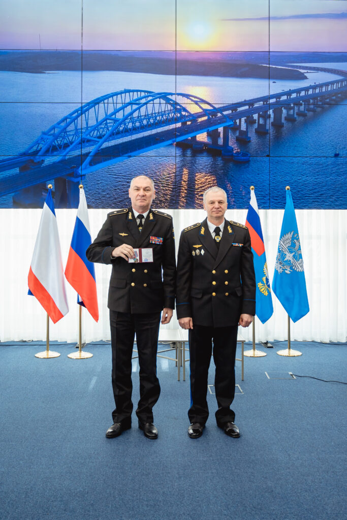 Генеральный директор ФГУП «УВО Минтранса России» Алексей Ковыршин (справа) вручил директору Краснодарского филиала Юрию Тхазаплижеву медаль «За усердие и доблесть» II степени