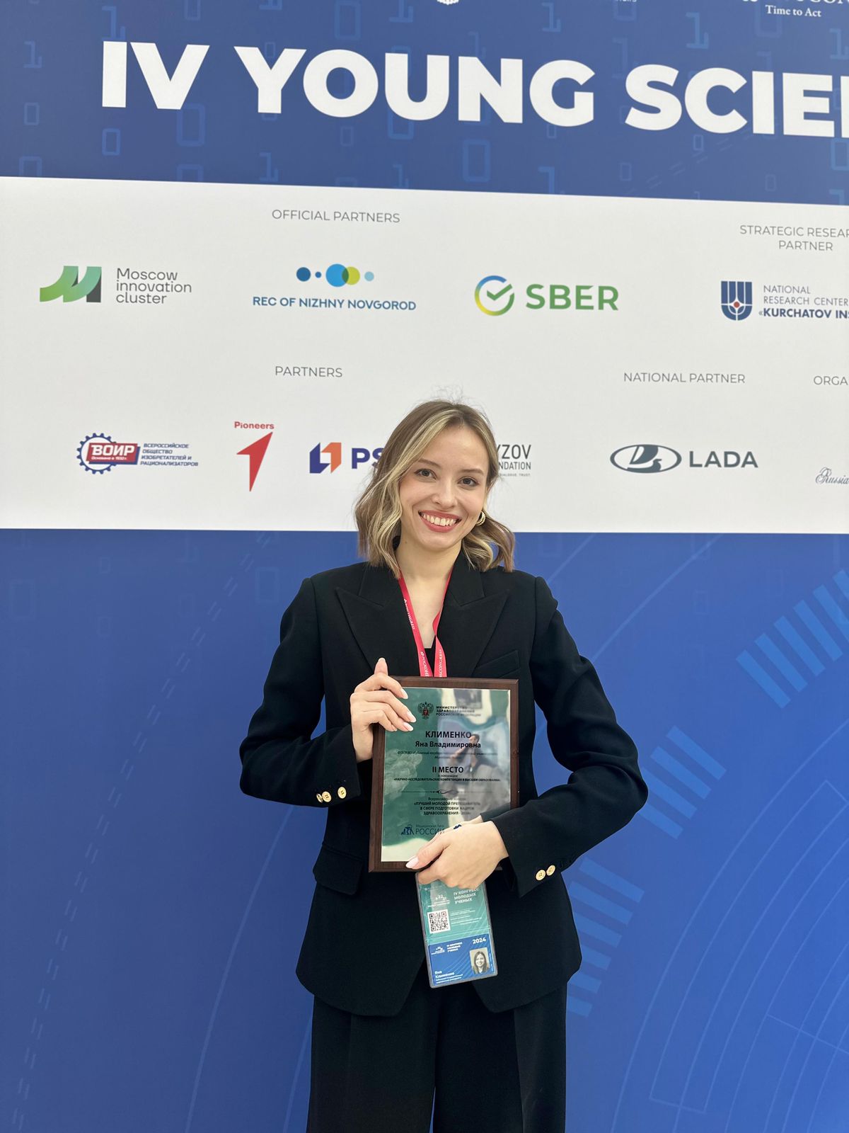 Ассистент кафедры биологии с курсом медицинской генетики КубГМУ Яна Клименко получила приз Всероссийского конкурса «Лучший молодой преподаватель в сфере подготовки кадров в отрасли здравоохранения – 2024». Она заняла второе место в номинации «Научно-исследовательские компетенции в высшем образовании», награждение состоялось на Конгрессе молодых ученых.