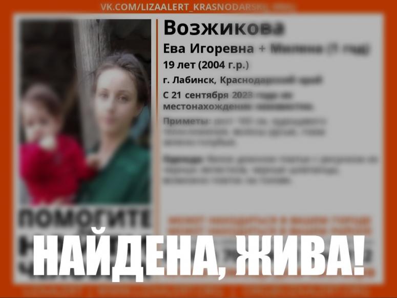Как сообщал «Югополис», молодая мать Ева Возжикова 21 сентября вышла из дома в Лабинске без вещей, но вместе со своим годовалым ребенком, и в течение нескольких суток связи с ней не было, телефон был недоступен.