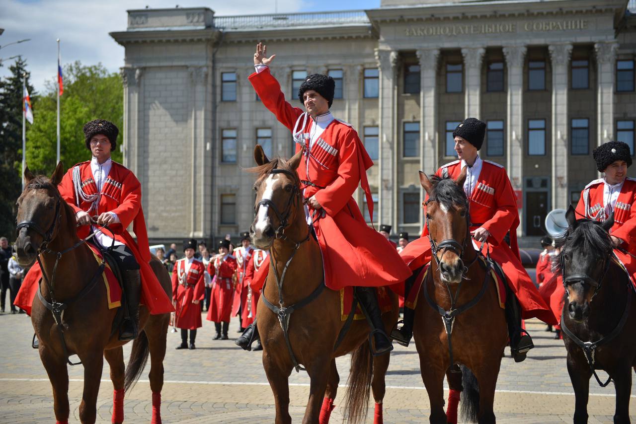 В Краснодаре в воскресенье, 13 апреля, возобновили проведение церемониала “Час славы Кубани”. Казаки (пешие и на лошадях) продемонстрировали собравшимся навыки владения шашкой, элементы фланкировки, строевую подготовку.
